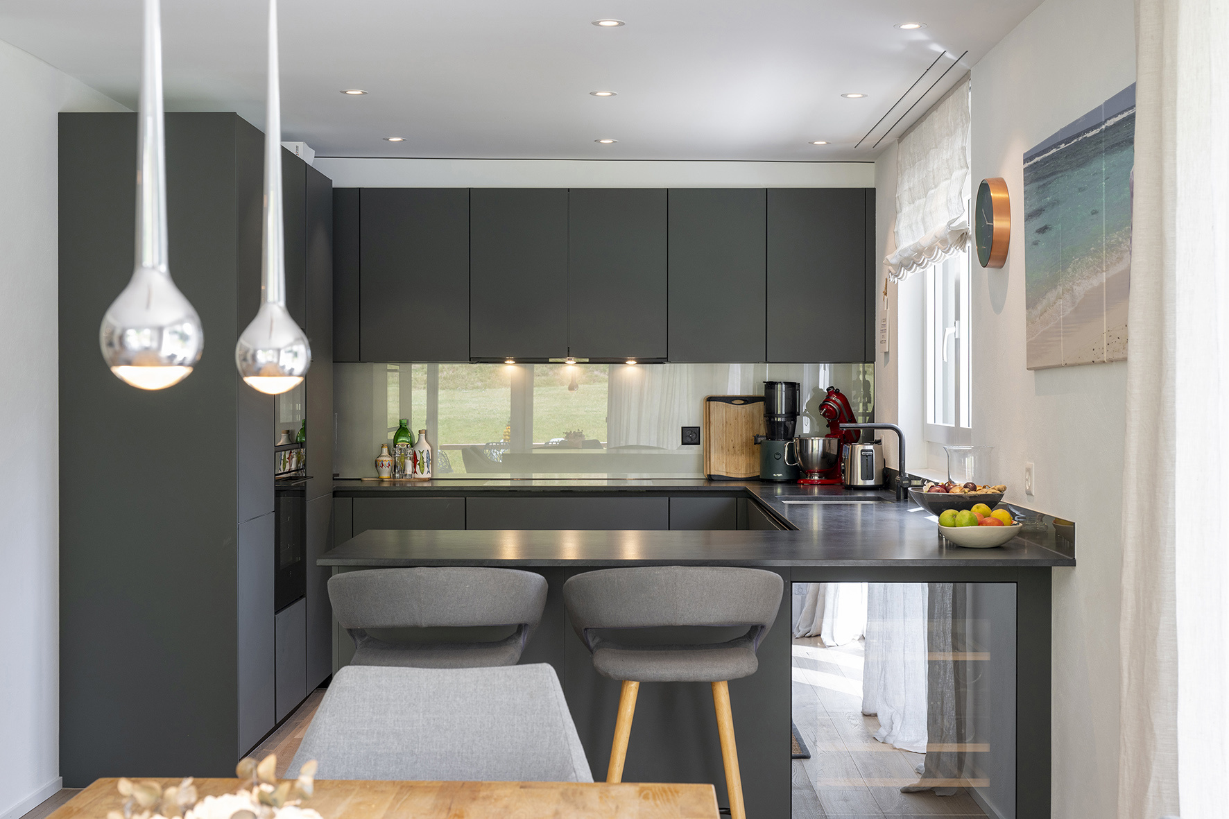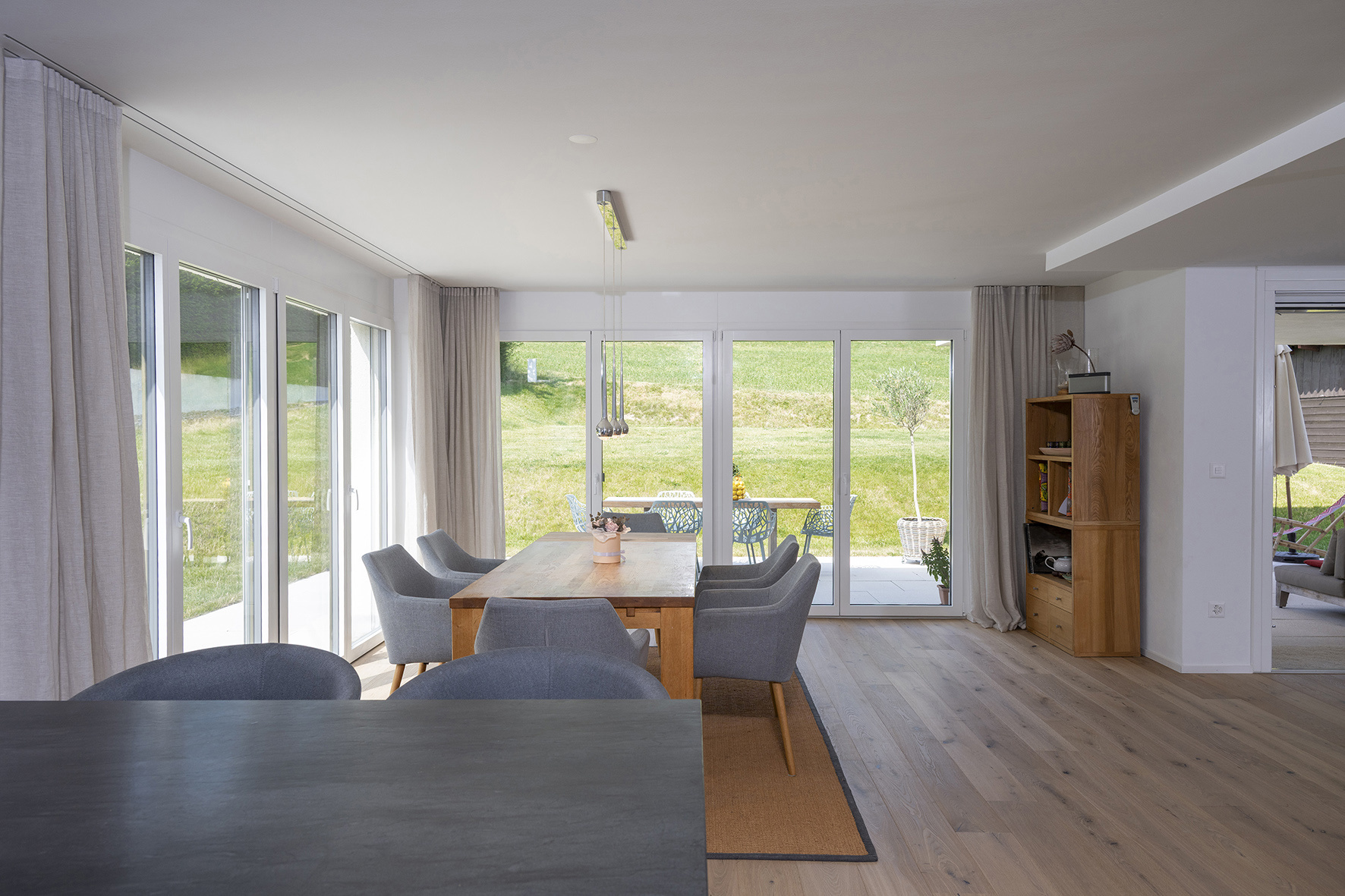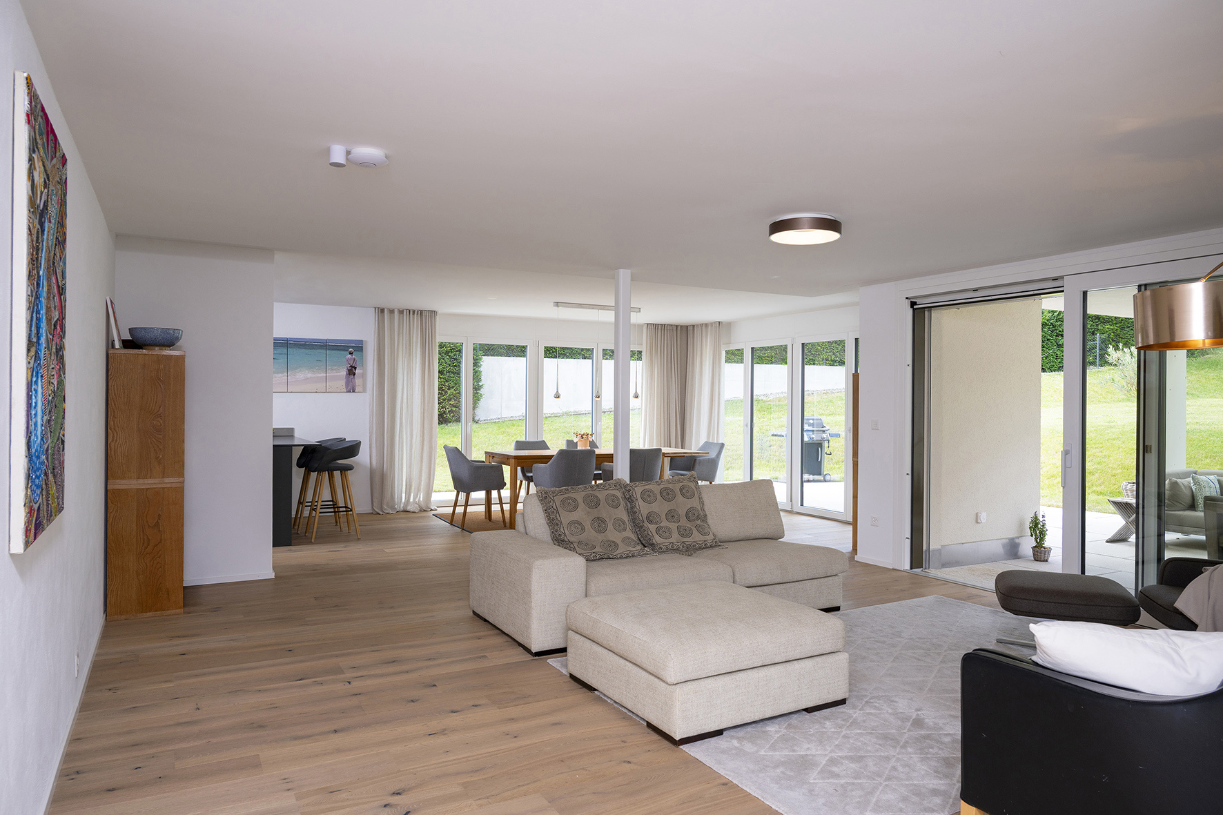 Ein zentraler Bestandteil des Umbaus war die Erweiterung des Wohnzimmers, das nun durch großzügige Raumverhältnisse und optimierte Belichtung besticht. Der neue Anbau fügt sich harmonisch in die bestehende Architektur ein und schafft fließende Übergänge zwischen Alt und Neu.